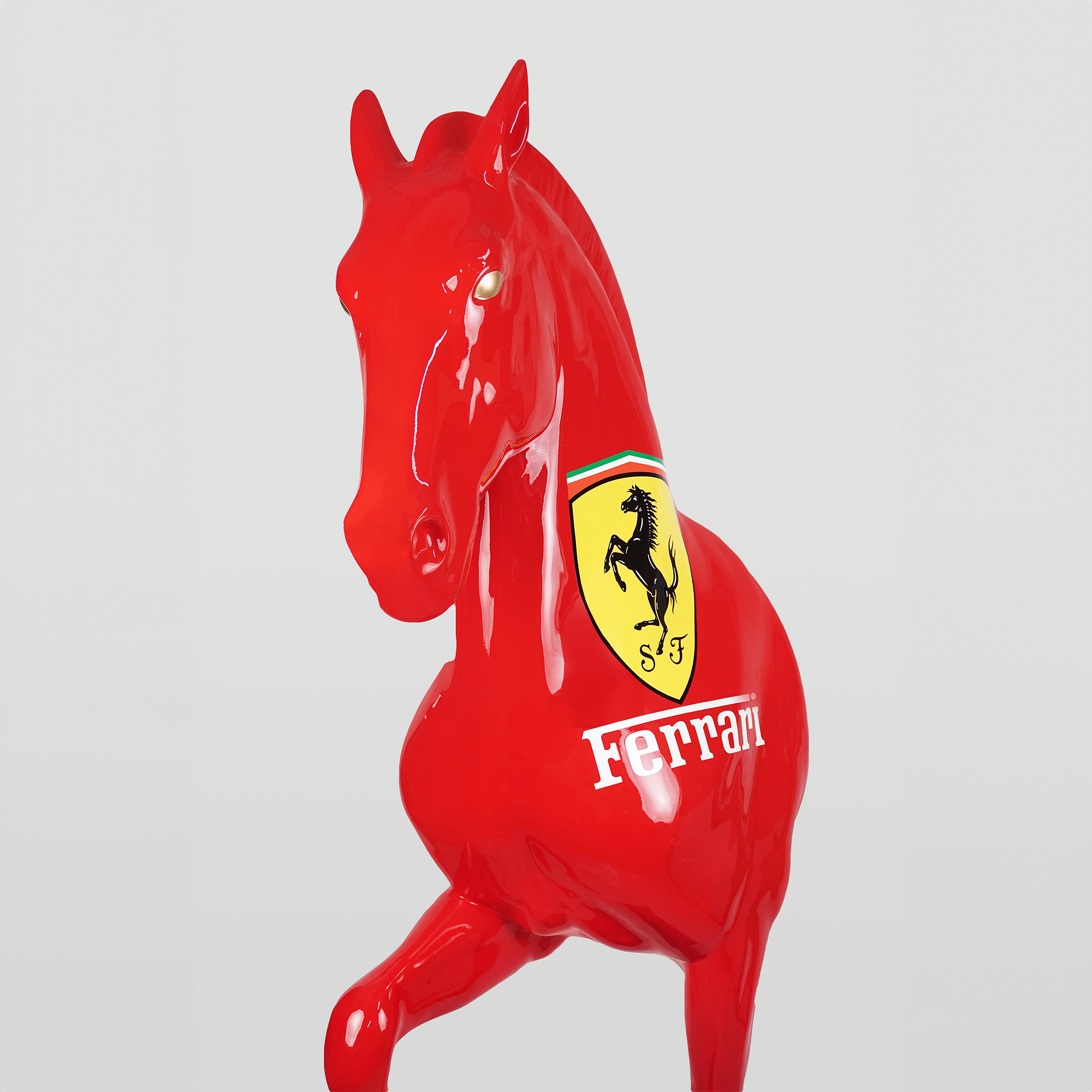 Naturalnej wielkości popiersie czerwonego konia Ferrari na postumencie